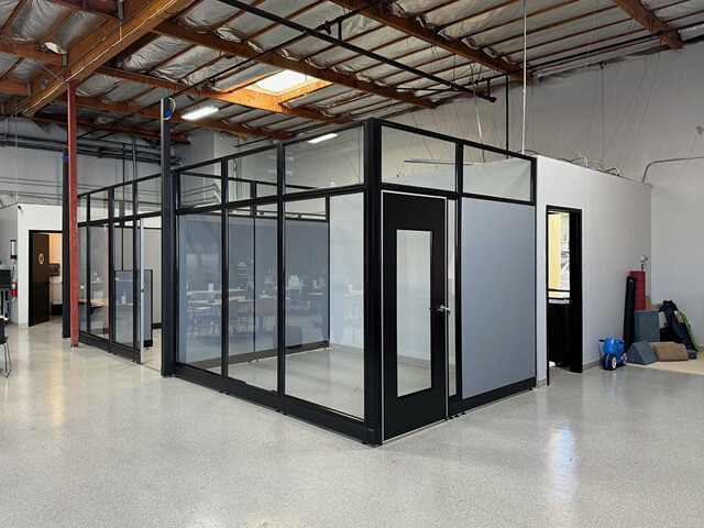 We recently completed a project in their office space in Milpitas, installing modular office walls to create two private spaces within an open plan office. This installation demonstrates the flexibility and practicality of modular wall systems in transforming open areas into functional workspaces. The tempered glass panels framed in black provide durability and structure, seamlessly integrating into the existing open layout.